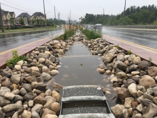 Revision as of 08:24, 23 August 2018 by Kyle menken (talk | contribs) (Rounded 'river rock' and a series of check dams slow incoming water, preventing erosion and promoting infiltration.)