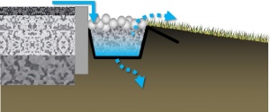 • Where flow comes off an impervious surface, an elevation drop of 75 to 150 mm to the surface of the diaphragm is recommended to dissipate energy, promote settling and allow for accumulation of sediment and debris between cleanings;